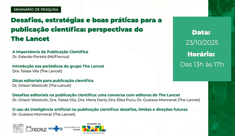 O Instituto Nacional de Infectologia Evandro Chagas (INI/Fiocruz) e a revista científica The Lancet promovem o seminário “Desafios, estratégias e boas práticas para a publicação científica: perspectivas do The Lancet”. A iniciativa reúne especialistas para discutir padrões editoriais, integridade em pesquisa e transparência no processo de submissão e revisão, incluindo o papel da inteligência artificial e seus limites éticos.